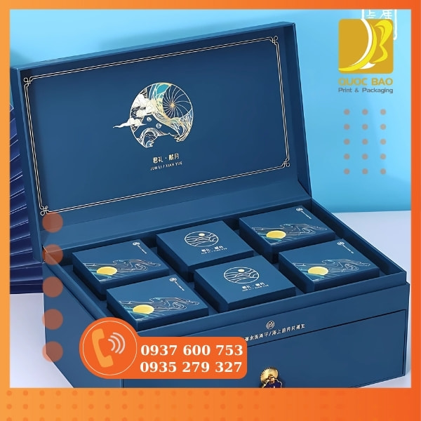 In hộp cứng cao cấp cho các sản phẩm bánh Trung Thu cao cấp. Hộp này không chỉ đẹp mà còn mang đến sự bảo vệ tốt nhất cho bánh.